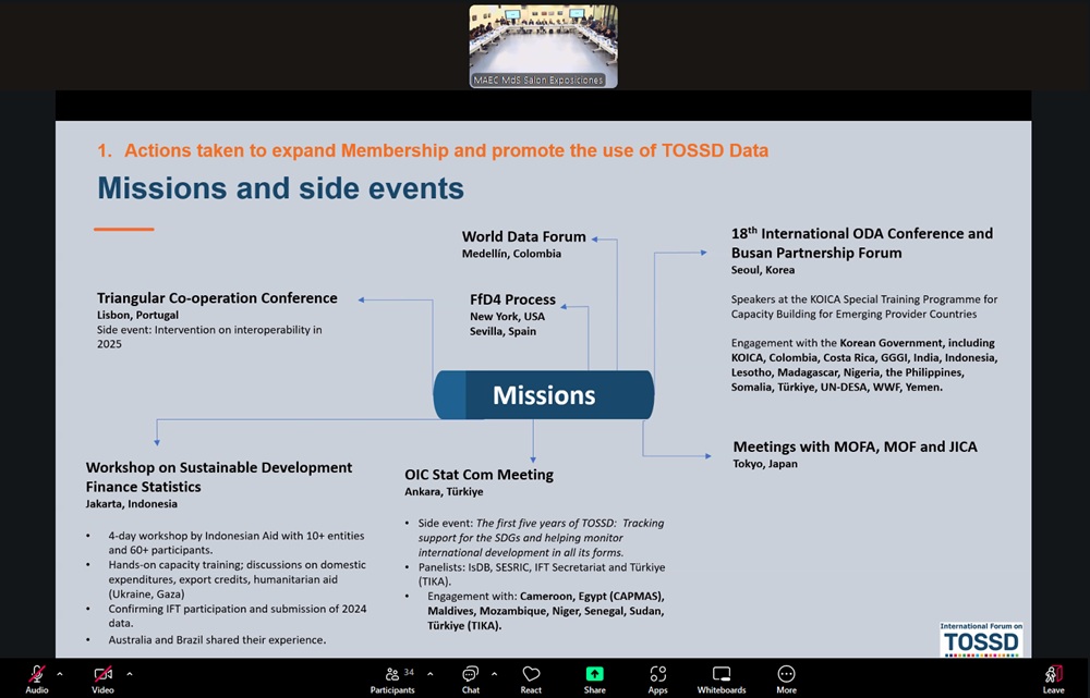 The General Assembly held on 21-22 October 2025 featured sessions on the expansion of the Forum’s membership, strategic priorities for 2025–2030, and ways to enhance the visibility and use of TOSSD data across diverse development cooperation contexts. Representing SESRIC, Mr. Abdulhamit ÖZTÜRK, Senior Statistics Officer, delivered an intervention under Agenda Item 2 of the General Assembly, sharing updates on SESRIC’s ongoing efforts to promote the TOSSD framework among OIC countries. It was underlined that SESRIC, as a founding member of the Forum, has been actively engaged in raising awareness and encouraging participation in the Forum’s work.